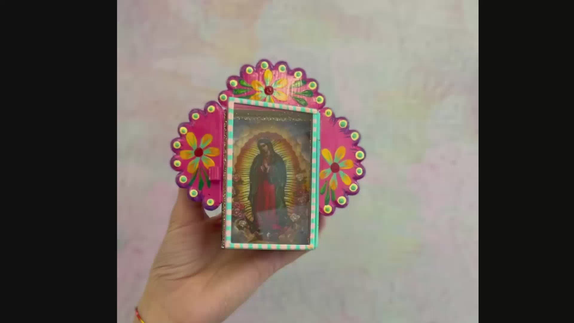 Decorative wall display shrine in 3D of the Virgen de Guadalupe with floral design. The glass window can be opened to express your prayers to Mary. Completely hand painted and internally embellished with glitter.