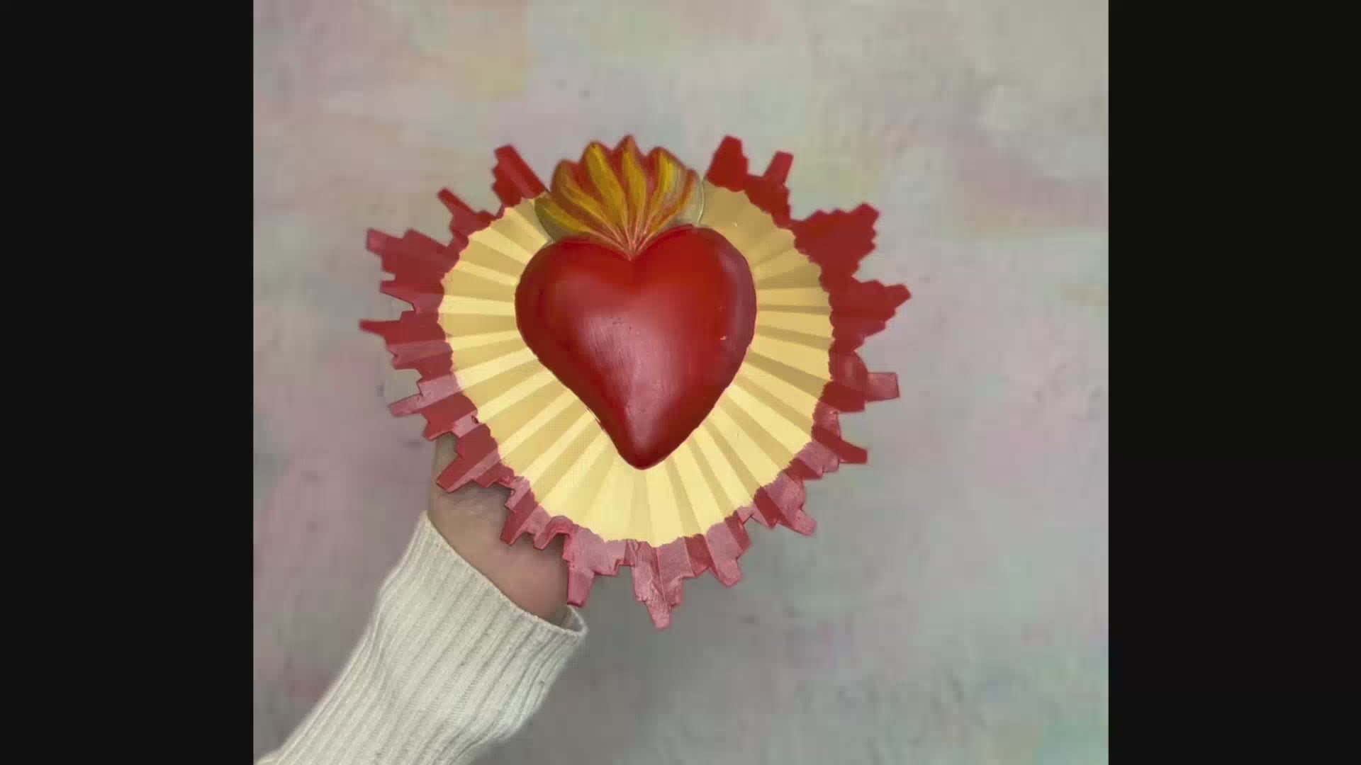 Décoration murale avec un cœur 3D monochrome central qui émet des rayons de lumière dorés avec un dégradé de contour. L'objet veut célébrer toutes les formes d'amour, de lumière et de pensées positives. Ex Voto - Amulettes porte-bonheur.