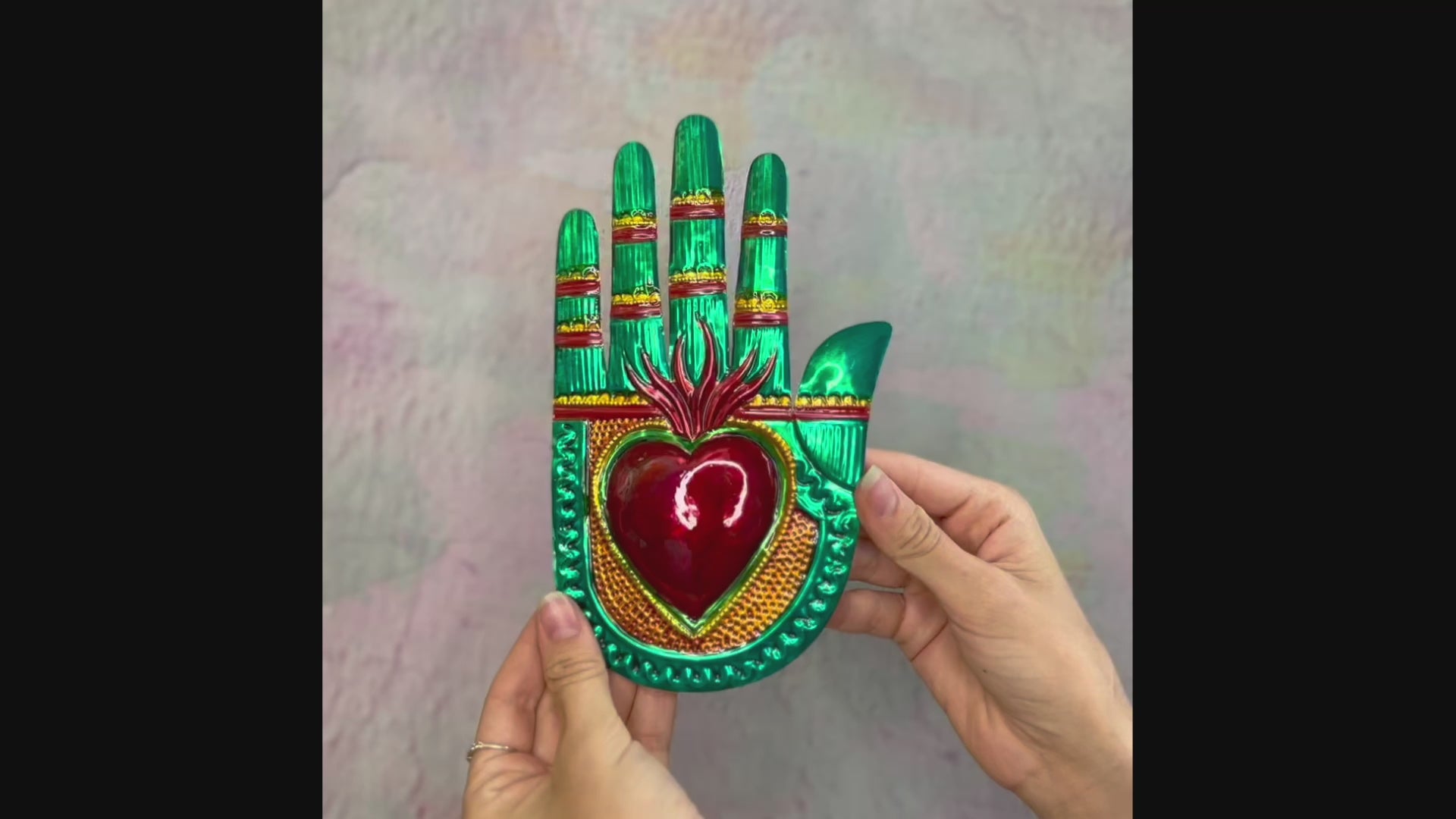 Décoration murale multicolore brillante en forme de main avec un cœur central, poinçonné en bas-relief. La main est largement considérée comme un symbole de charité et d'empathie : cela signifie « du cœur ». Dans différentes cultures, placer une main sur la porte d'entrée signifie protection et bonne chance. Ex Votos - porte-bonheur.