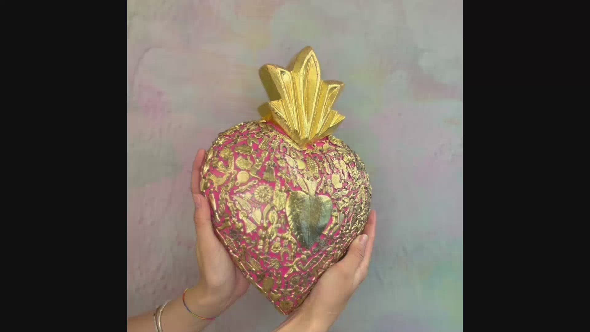 Décoration murale maxi cœur flamboyant 3D, entièrement ornée de pendentifs dévotionnels Milagros uniques, plaqués or ou argent, appliqués à la main et cloués sur la base en bois. Ex Voto - porte-bonheur.