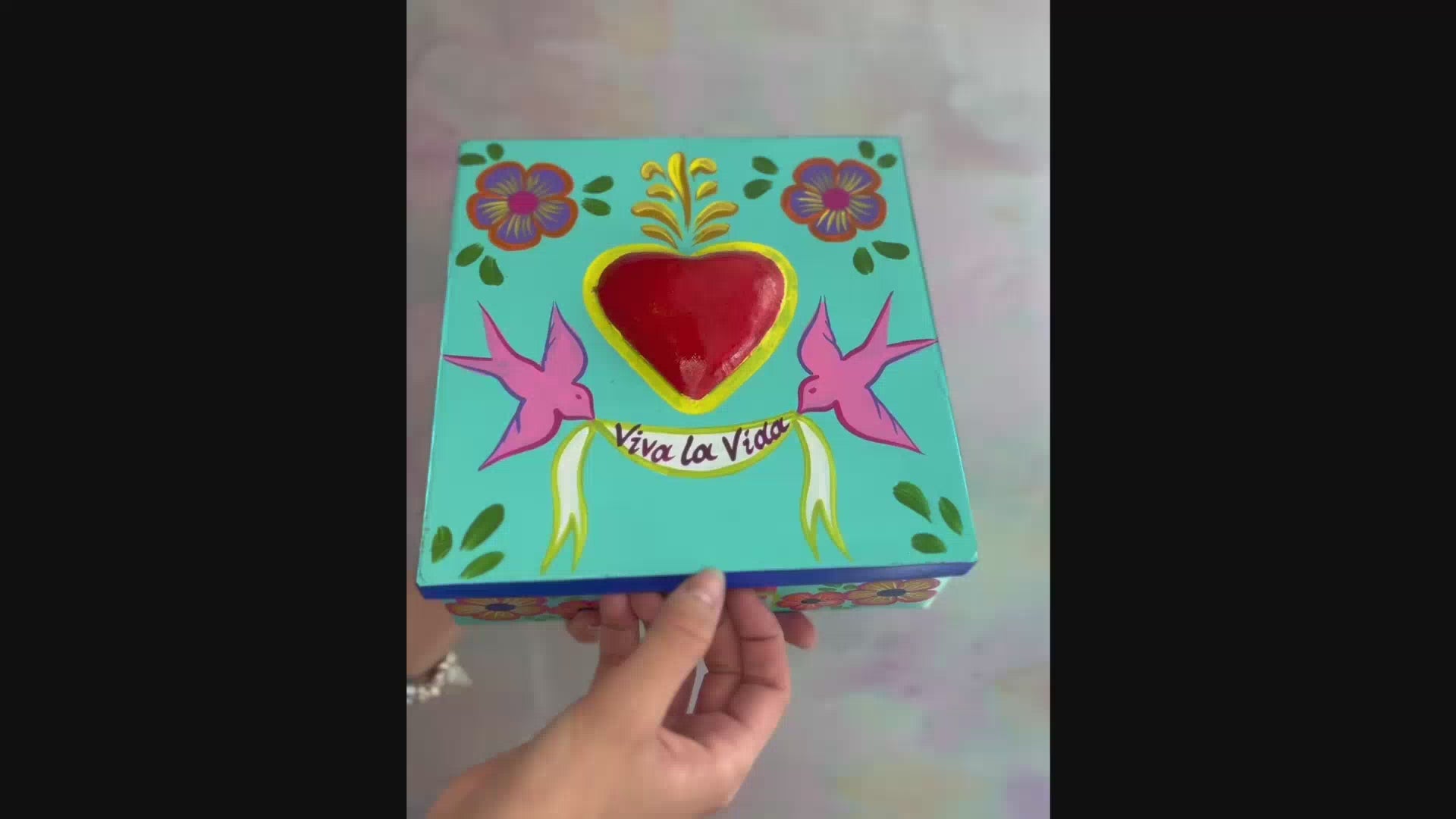 Boîte décorative carrée multicolore avec cœur 3D central, peinte à la main avec la phrase "Viva la Vida", des colombes volantes et des fleurs. Les colombes symbolisent l'espoir, la légèreté et la paix.