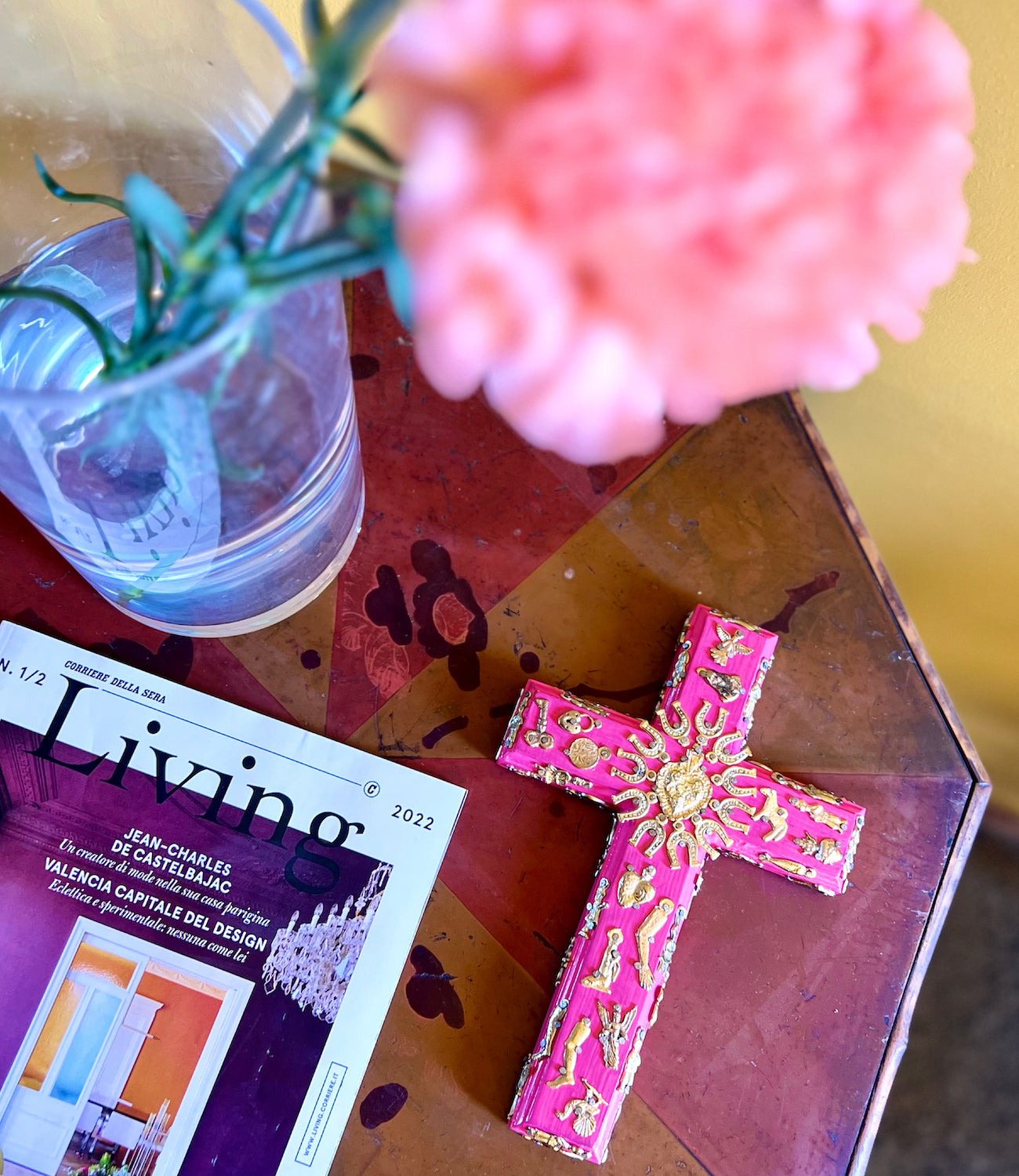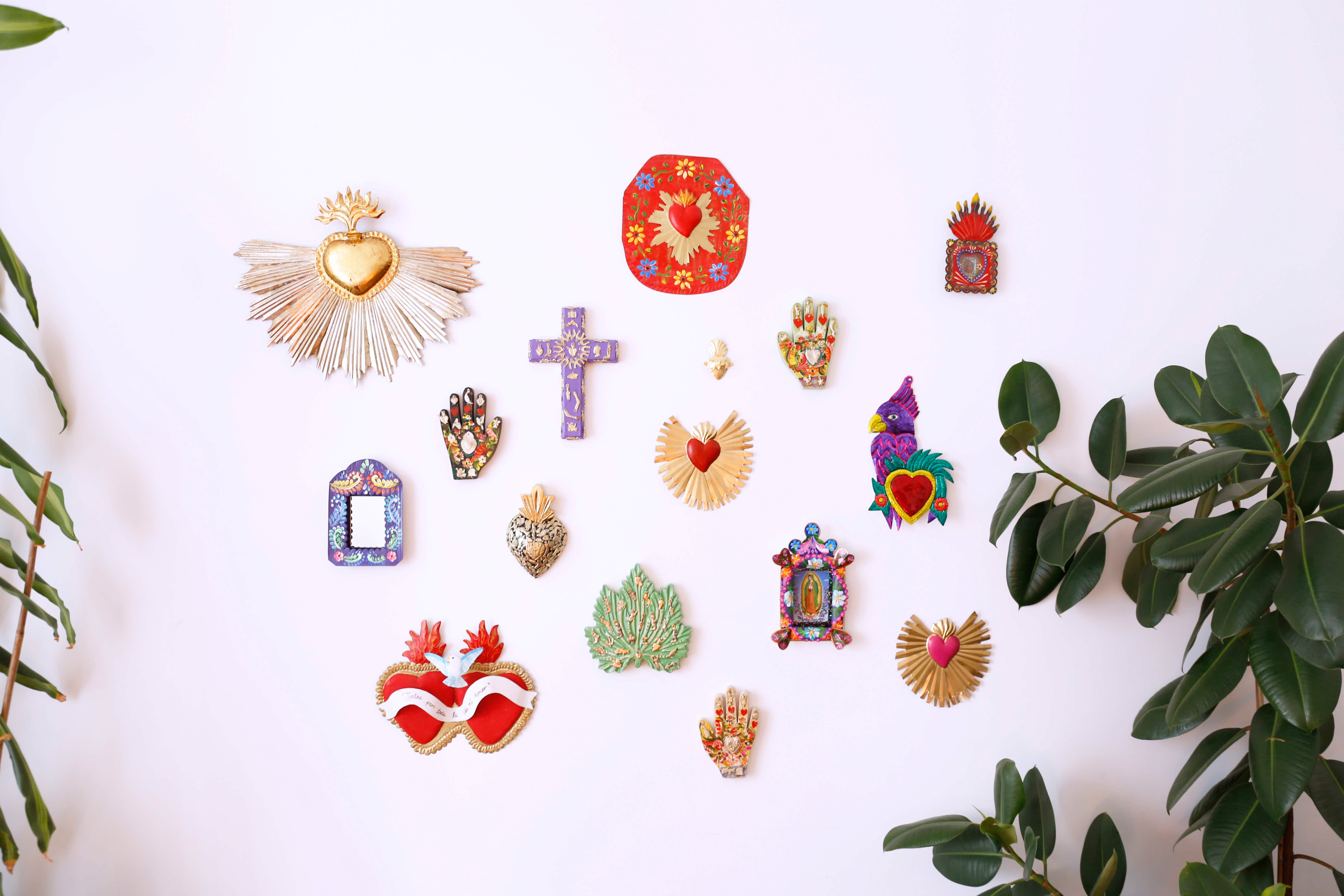 Maxi decorazione murale a cuore fiammeggiante in 3D, completamente adornata da ciondoli devozionali Milagros unici, placcati in oro o argento, applicati manualmente e inchiodati alla base in legno. Ex Voto - Amuleti Portafortuna.