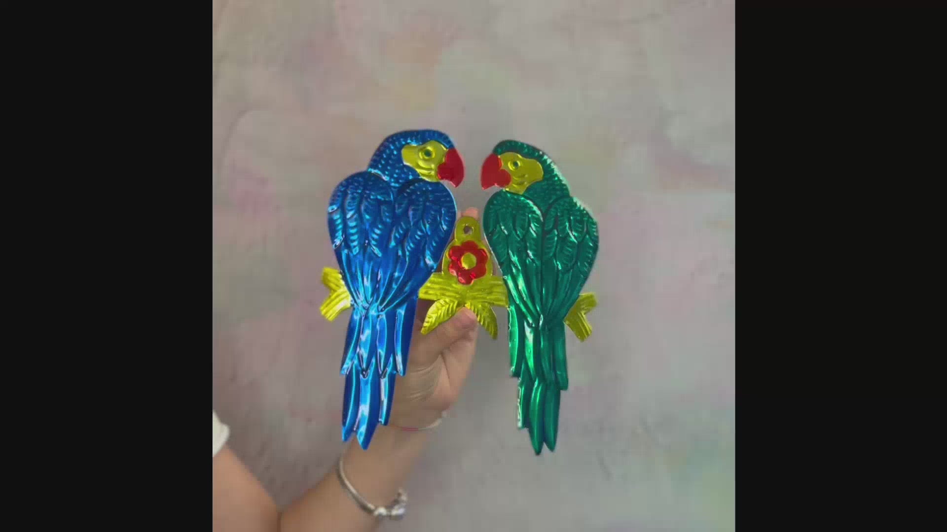 Decorazione murale lucida con coppia di pappagalli a doppio colore posati su un ramo. Il pappagallo simboleggia l'amore e l'abbondanza ed è spesso collegato all'abbandono della zona di comfort e al viaggio nel mondo. Ex Voto - Amuleti Portafortuna.