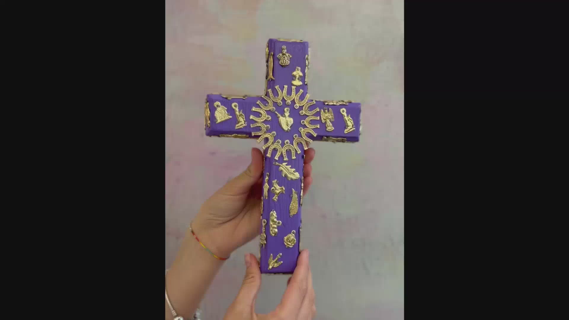 Decorazione murale 3D a forma di croce, impreziosita dall'applicazione di ciondoli devozionali Milagros unici nel loro genere. La croce è un simbolo cosmico potente, che rappresenta il cerchio delle energie della natura: collega la terra al cielo e l'ovest all'est. Un prezioso amuleto per proteggere il vostro luogo. Ogni pezzo è unico. Ex Voto - Amuleti Portafortuna.