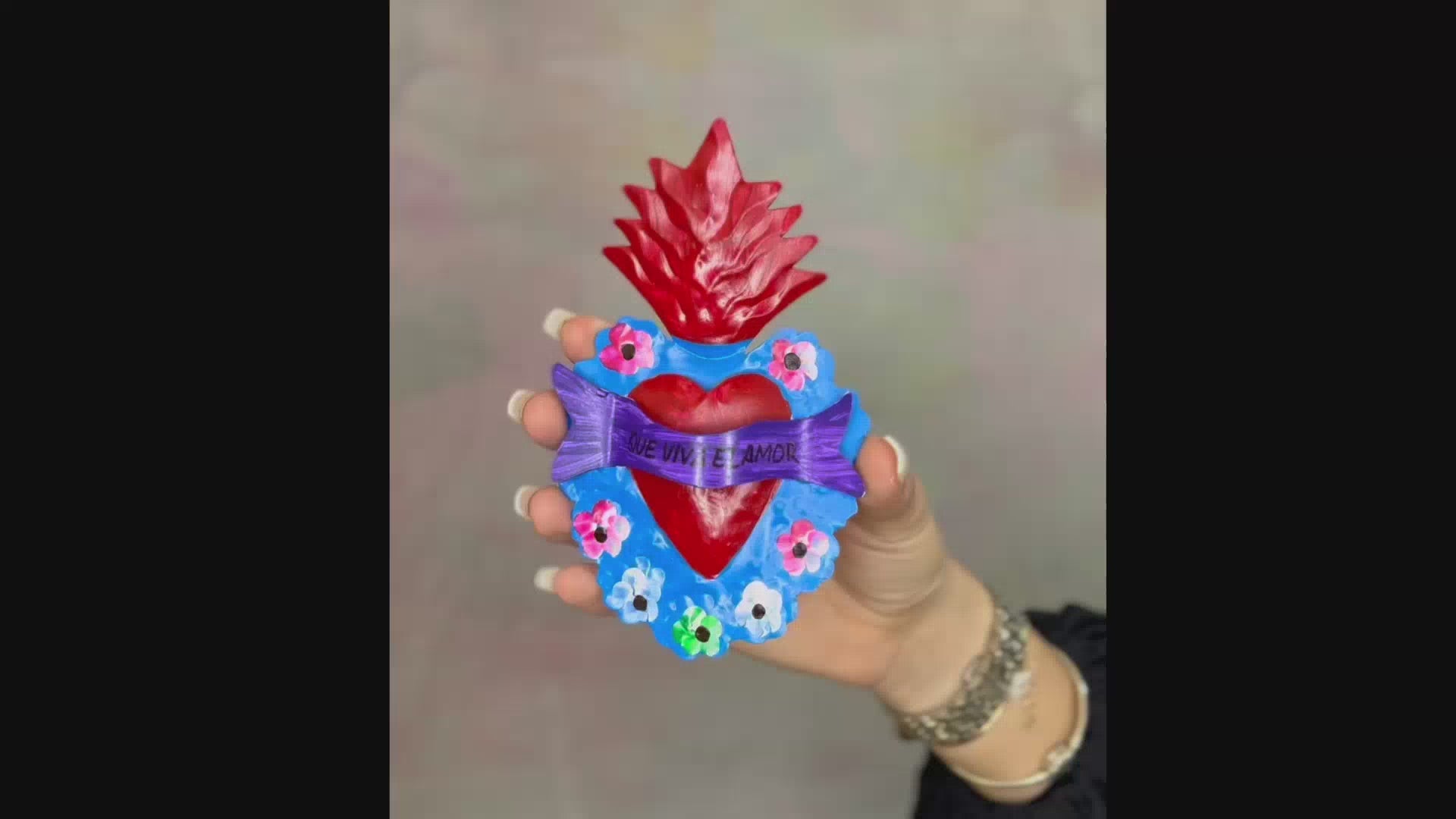 Decorazione da parete a forma di cuore multicolore con frase spagnola "Que Viva El Amor" e disegno folk. L'oggetto vuole celebrare tutte le forme dell'amore, della luce e dei pensieri positivi. Ex Voto - Amuleti Portafortuna.